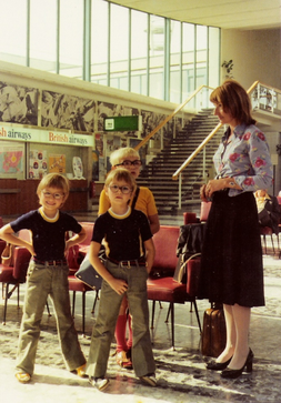 Wer hat sie da fotografiert am Flughafen von Schwechat im Jahre 1975 mit ihren drei Kindern auf dem Weg in eine neue Welt? Mama ist etwas überfordert. Man sieht, dass wir nicht gänzlich zu kontrollieren sind. Sehr putzig und sehr gefährlich, es kann jeden Moment, passieren, dass wir aus der Form fallen und uns danebenbenehmen in drei, vier, fünf verschiedenen Richtungen. In Wahrheit unkontrollierbare Energiebündel. Frech, lustig, ohne Arg - aber listig. Und zwitscher zwitscher, flatter flatter, hüpf hüpf sind wir schon in alle Richtungen geflogen und Mama muss Papa Rede und Antwort stehen für unser Fehlverhalten, an dem sie irgendwie schuld ist – denn sie ist ja die Mutter.